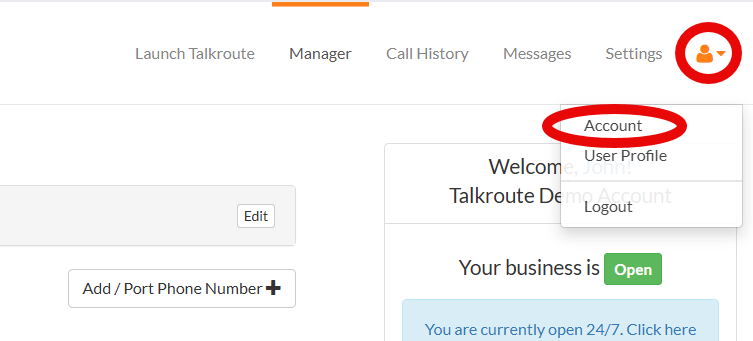 Log in to your Talkroute account and navigate to the user icon, then select Account.