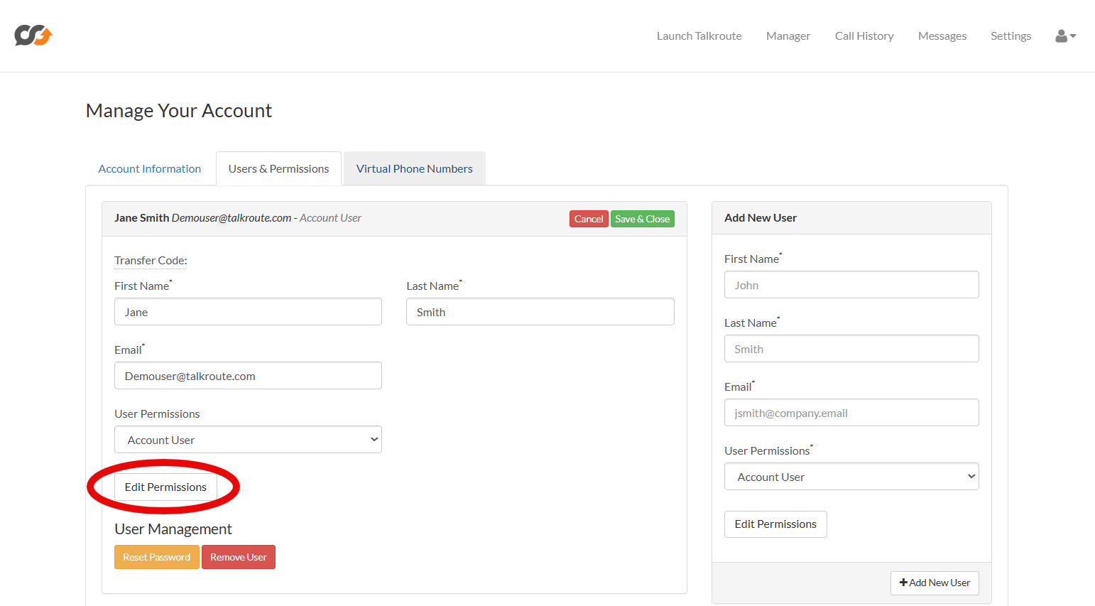 Select the desired permission level for each Talkroute phone number, then click Save Permissions.