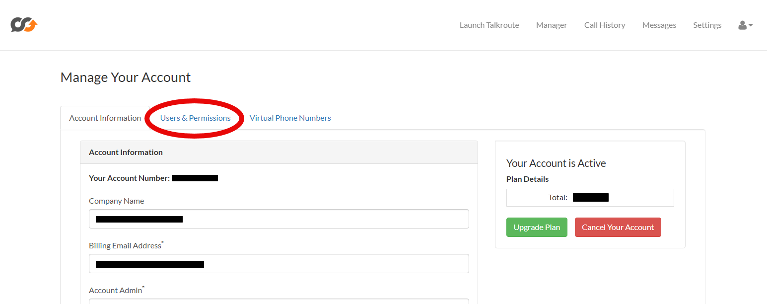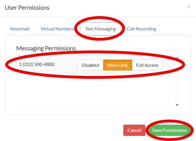 Text messaging permissions control what level of access each user has to text messaging within your Talkroute account. You can set permissions individually for each user and for each Talkroute phone number.