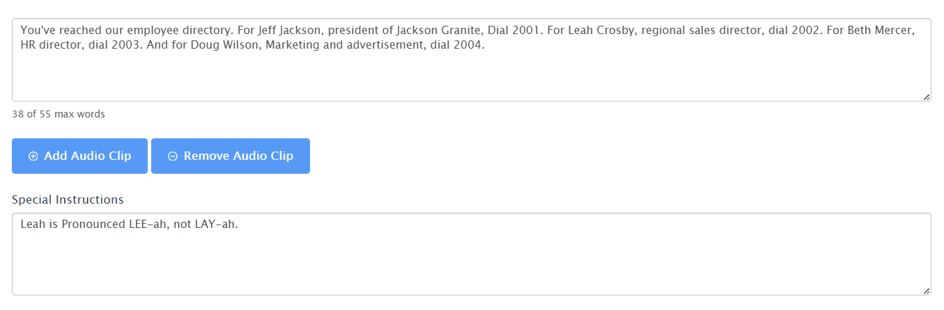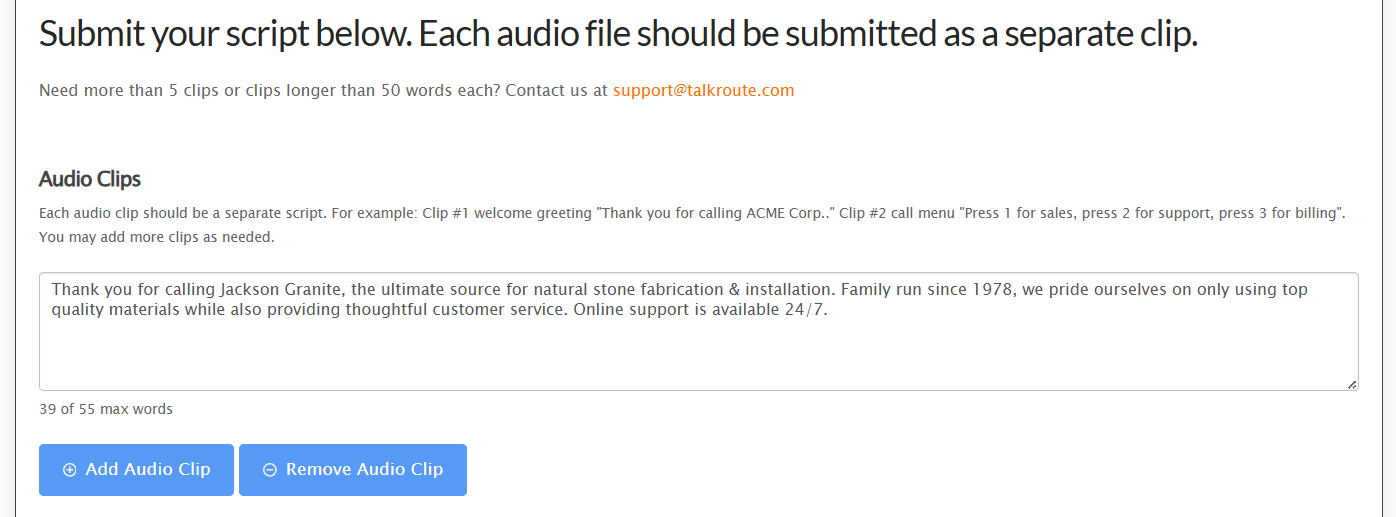 Submit your scripts. 5 clips are included with select plans, though you don't have to use them all at once. If you're submitting more than one clip, select Add Audio Clip and enter your additional scripts.