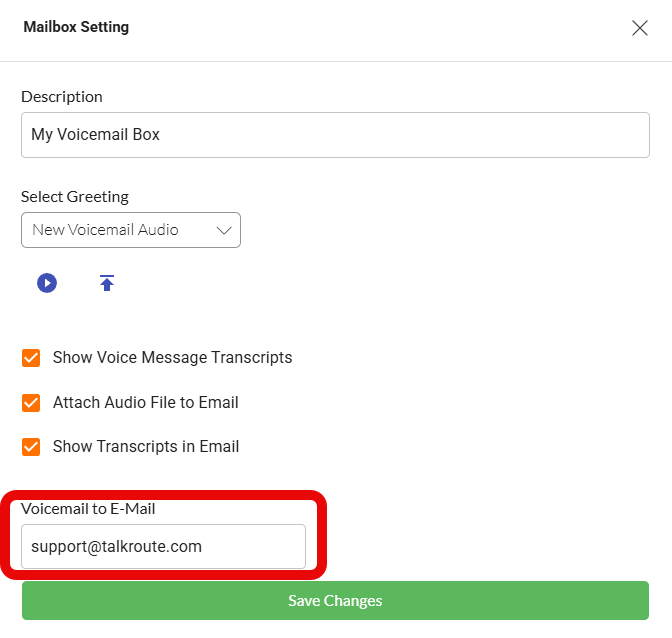 Enter the desired email address in the Voicemail to E-Mail field and click Save Changes.
