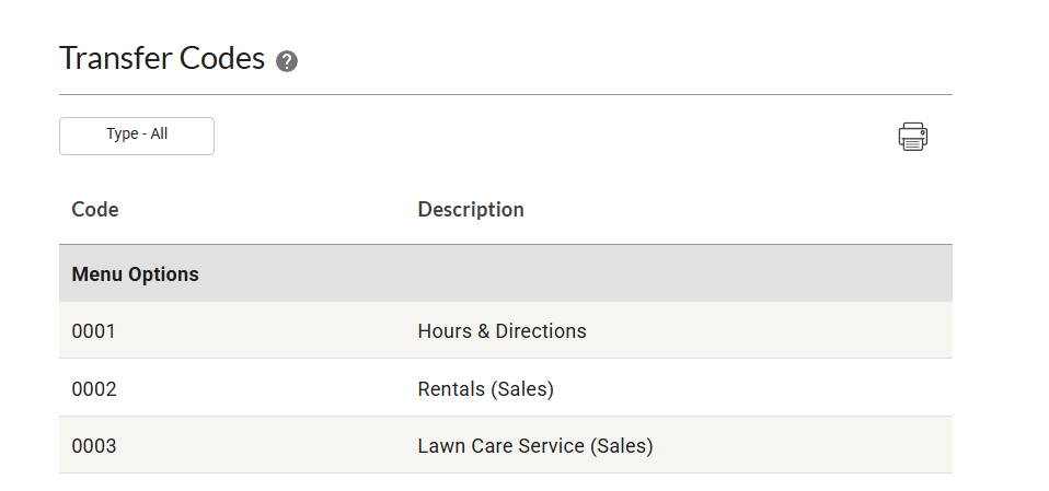Your 4-digit transfer codes are listed for each menu option, virtual phone number, forwarding phone number, Desktop Device, extension, and voicemail box. Use the filter to view specific code types, or click the print button to print the list.