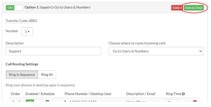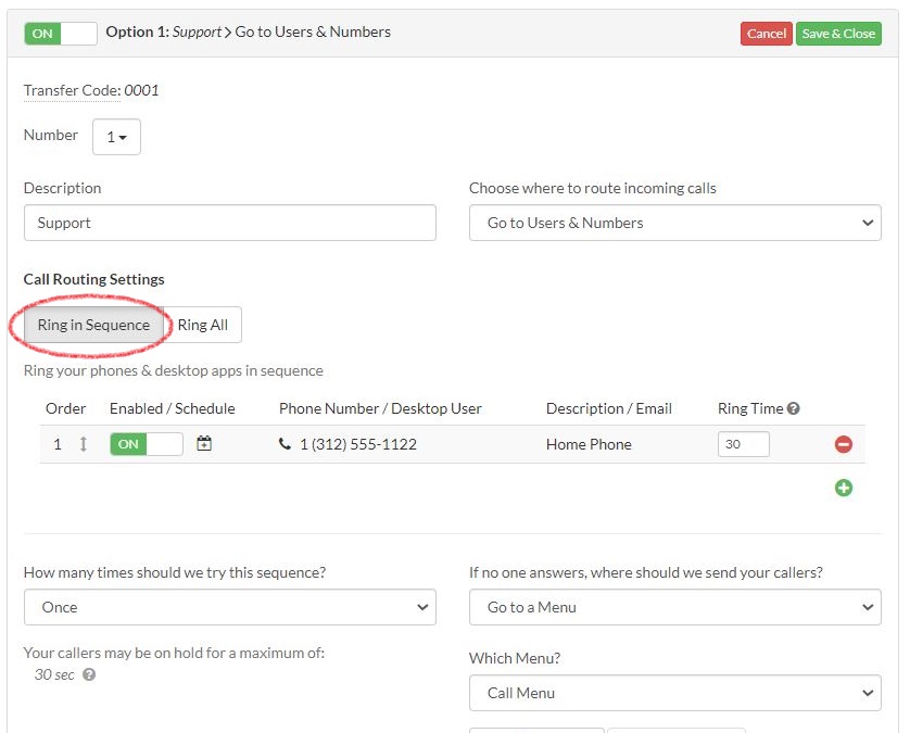 Ring in Sequence is a ring strategy that rings your forwarding phone numbers one at a time in a specific order. You can customize the ring time for each phone and set how many times to repeat the sequence before sending the call to voicemail, a call menu, or disconnecting.
