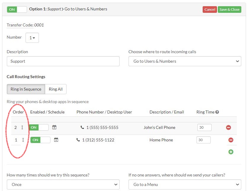 Drag and drop your forwarding phone numbers into the order you want them to ring.