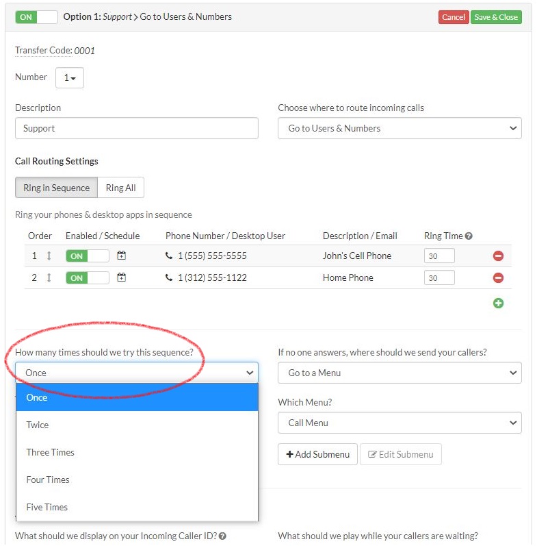 Adjust how many times you want Talkroute to repeat the sequence before sending the call to the end destination.
