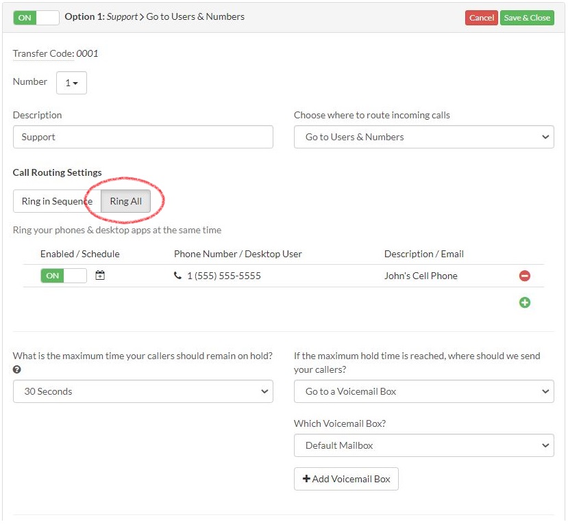 Ring All is a ring strategy that rings all of your forwarding phone numbers at the same time. When any phone answers, the other phones stop ringing. You can also set the maximum hold duration for callers before the call is sent to voicemail, a call menu, or disconnected.