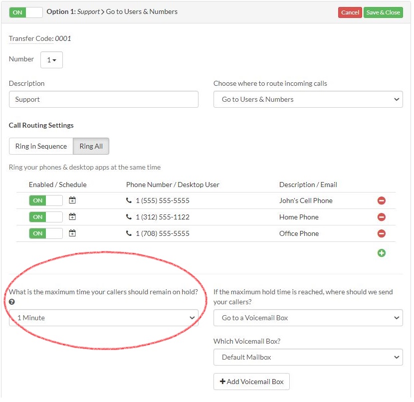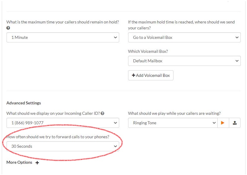 Adjust the maximum hold time to set how long callers wait before being sent to voicemail, a call menu, or disconnected. While on hold, Talkroute will attempt to ring your phones in 30-second increments up to the selected maximum.