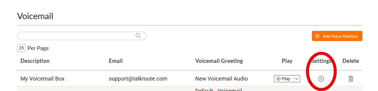 Find the voicemail box you wish to update and click the gear icon to open the mailbox settings.